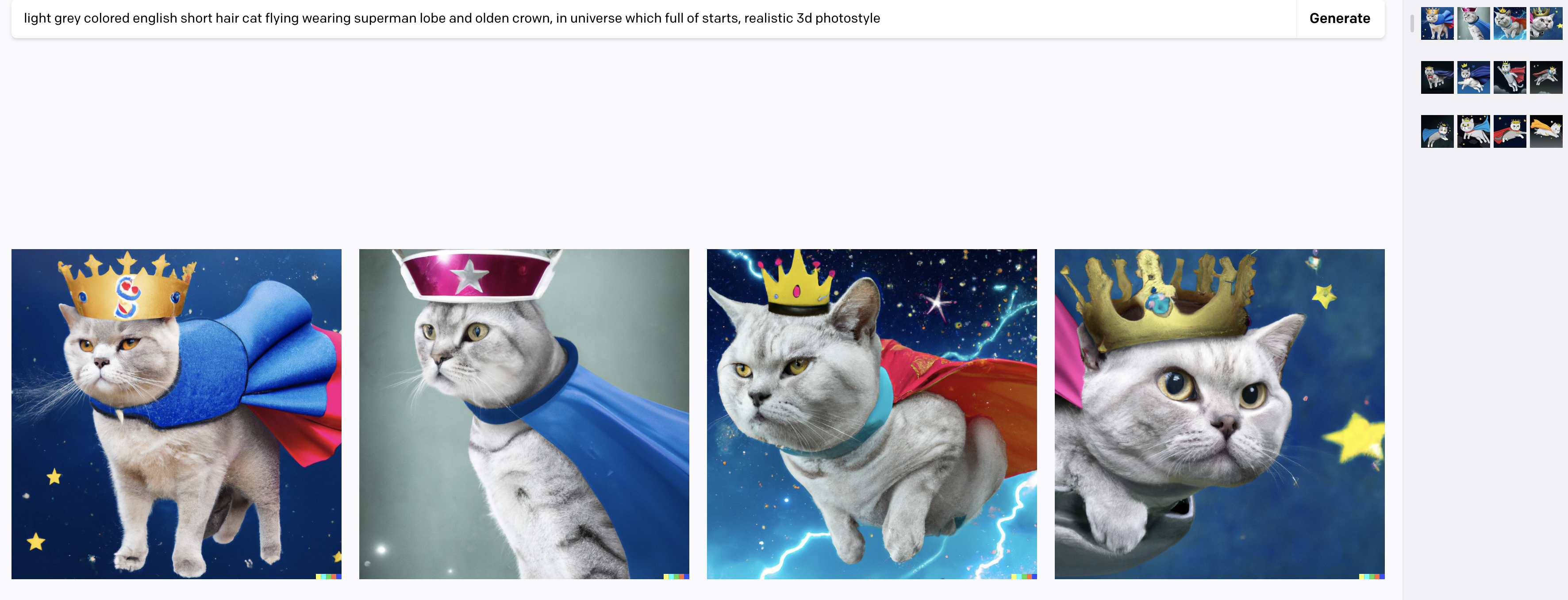 Light grey colored english short hair cat flying wearing superman lobe and golden crown, in universe which full of starts, realistic 3d photo sytle.이라고 적어보았습니다. 밝은 회색의 잉글리시 쇼트헤어 캣이 슈퍼맨 망토를 두르고 금색 왕관을 쓰고 별이 가득한 우주를 날아다니는 이미지를 3D 사진 스타일로 만들어 달라고 요청해 보았습니다.